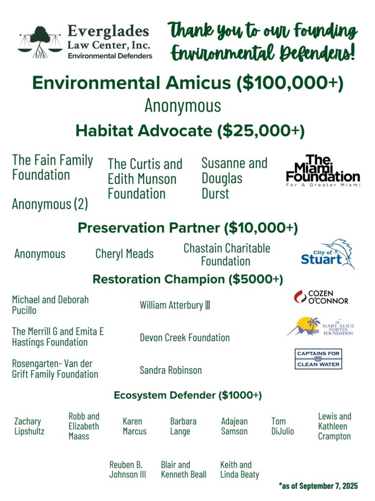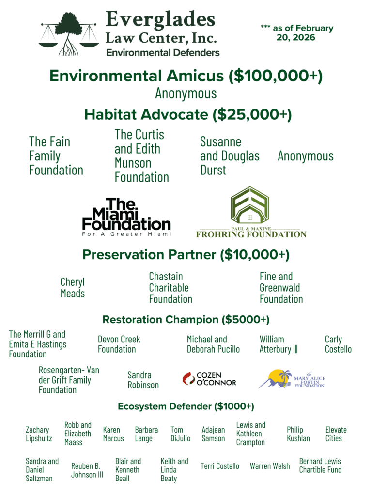 The Environmental Defenders program recognizes and engages the Everglades Law Center’s most committed supporters. Defenders provide crucial unrestricted funding that empowers ELC to swiftly address emerging environmental challenges in South Florida. This support ensures that ELC can continue advocating, litigating, and negotiating to protect the region’s ecosystems and communities, including endangered species, wetlands, and waterways, while building climate resilience. Members are at the forefront of efforts to safeguard the future of South Florida, and their contributions are instrumental in driving meaningful environmental change.